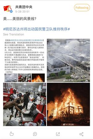 当佩洛西使用此话评价香港事务时就遭到了美国国内大范围的抵制与批评,这次共青团中央虽然是反讽再次引用此话但亦被翻车,有评论认为:“把阵营摆在基本的价值面前,人命便成了冷冰冰的较量。但凡对生命有一丁点的尊重,也不会说出这种话。”可见各国政客们为了互怼不惜幸灾乐祸,而夹在中间最惨的则是在骚乱城市下艰难生存的人民。也有人为共青团中央小编鸣不平,说“共青团中央小编做了什么让网友如此悲愤?他把美国对中国香港说的话重复了一遍。”